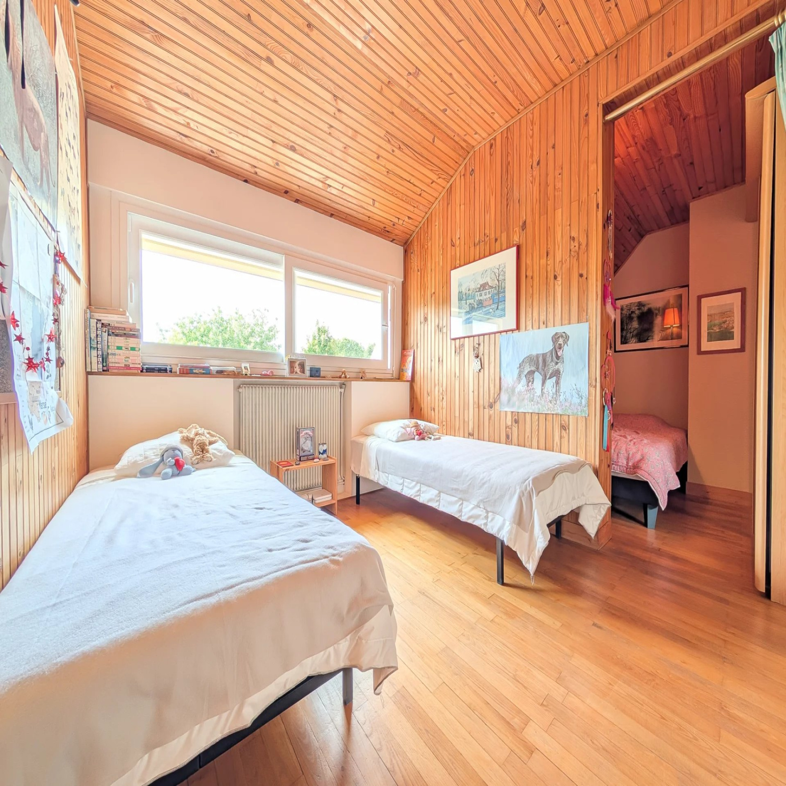 L'étage est composé d'un palier, d'un espace de rangements, de deux très belles chambres de plus de 18m² et d'une salle de bains avec toilettes.