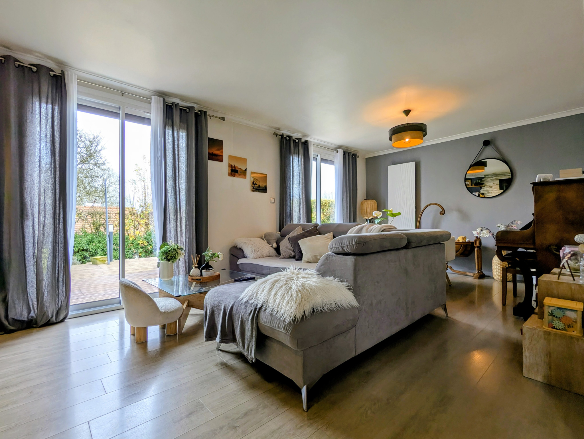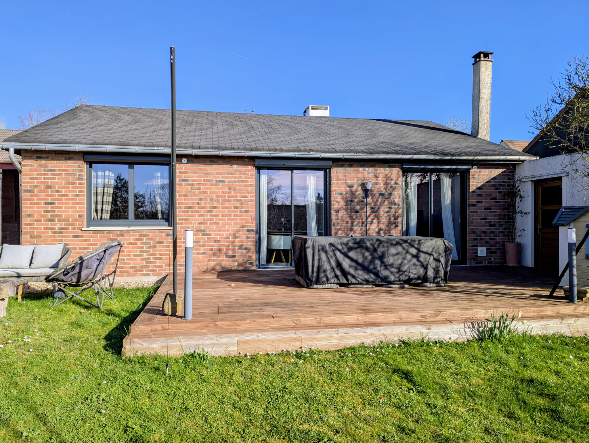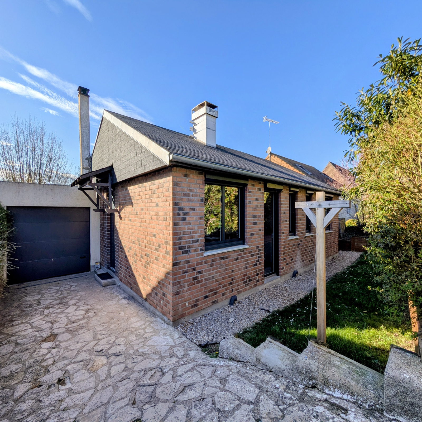 Travaux récents : menuiseries aluminium, radiateurs, cheminée insert, salle de bains, WC, terrasse, portail électrique, volets roulants électriques, porte de garage électrique.