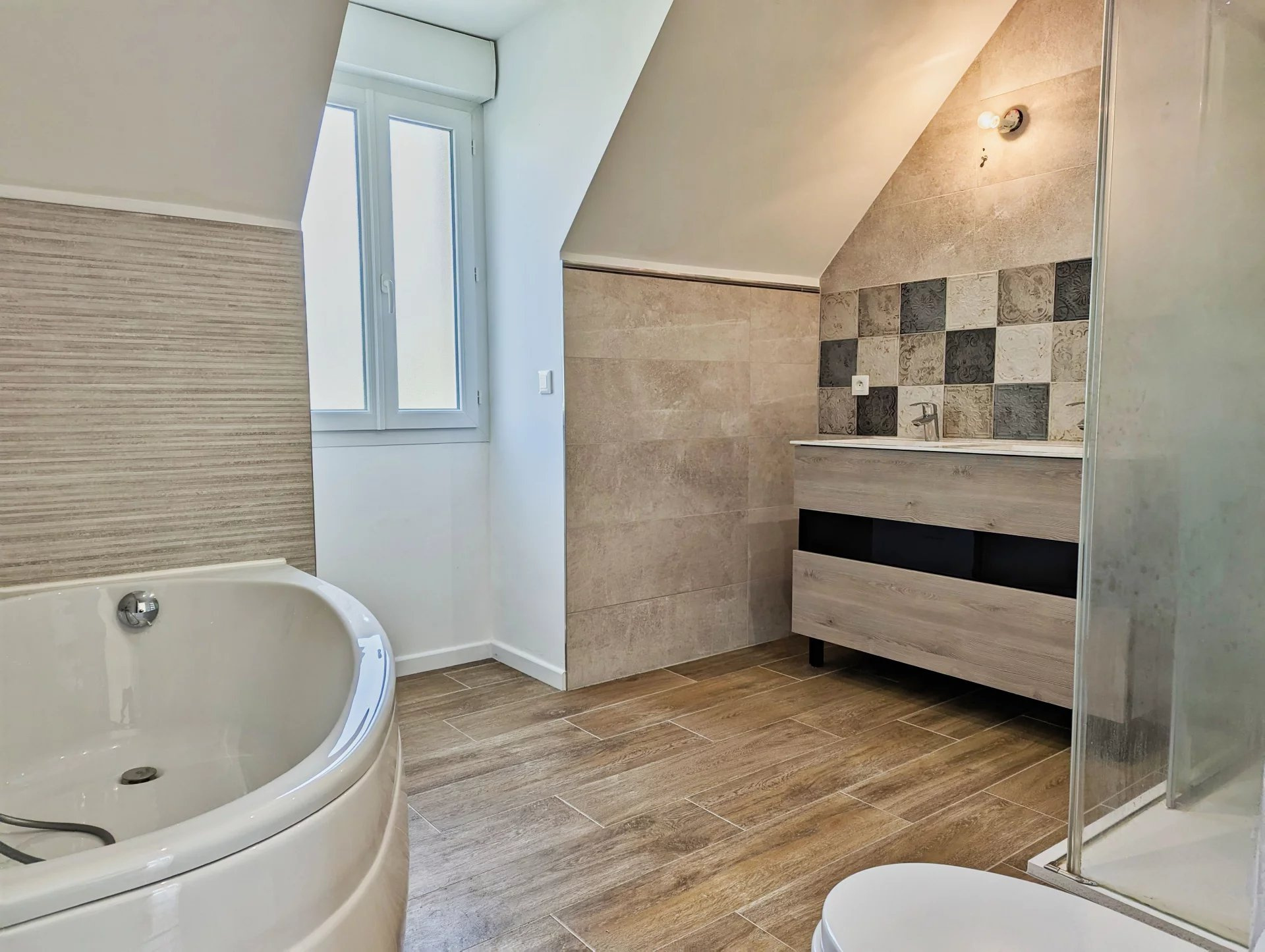 - à l'étage, un palier (espace bureau) dessert une suite parentale (chambre/dressing/salle de bains et douche/toilettes), deux chambres avec placards, une seconde salle de bains avec toilettes.