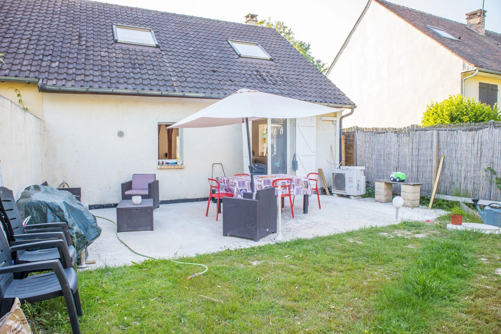 EXCLUSIVITE - VISITE VIRTUELLE DISPONIBLE- Située à la Jaunière, quartier d'Adainville, maison mitoyenne d'environ 90m² sur parcelle de 368m². Elle est composée au RDC d'une belle pièce de vie lumineuse avec cheminée insert, d'une cuisine aménagée, d'une salle d'eau et de wc. A l'étage, une pièce palière avec rangements dessert deux petites chambres elles aussi équipées de rangements (possibilités de réaménagement). Maison chauffée par pompe à chaleur (chaud et froid). Terrasse, jardin, deux places de parking.